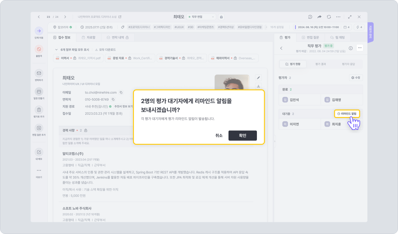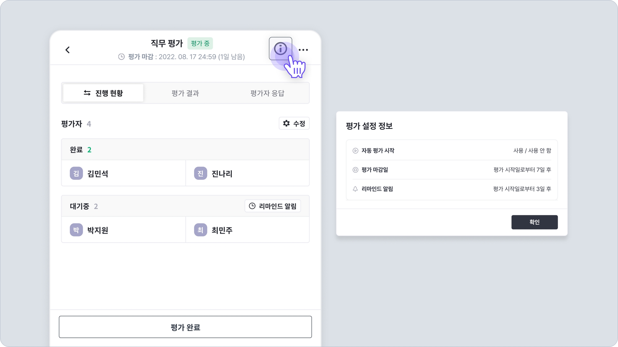 평가가 늦어지고 있는 평가자에게는 리마인드 알림을 보낼 수 있습니다. 평가 현황 탭에서 아직 대기중 상태로 표시되는 평가자들에게 리마인드 알림을 일괄 전송해 보세요.
