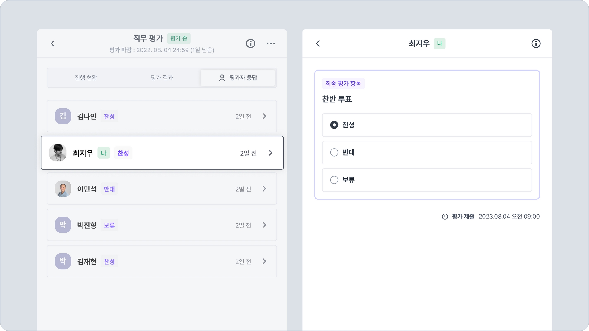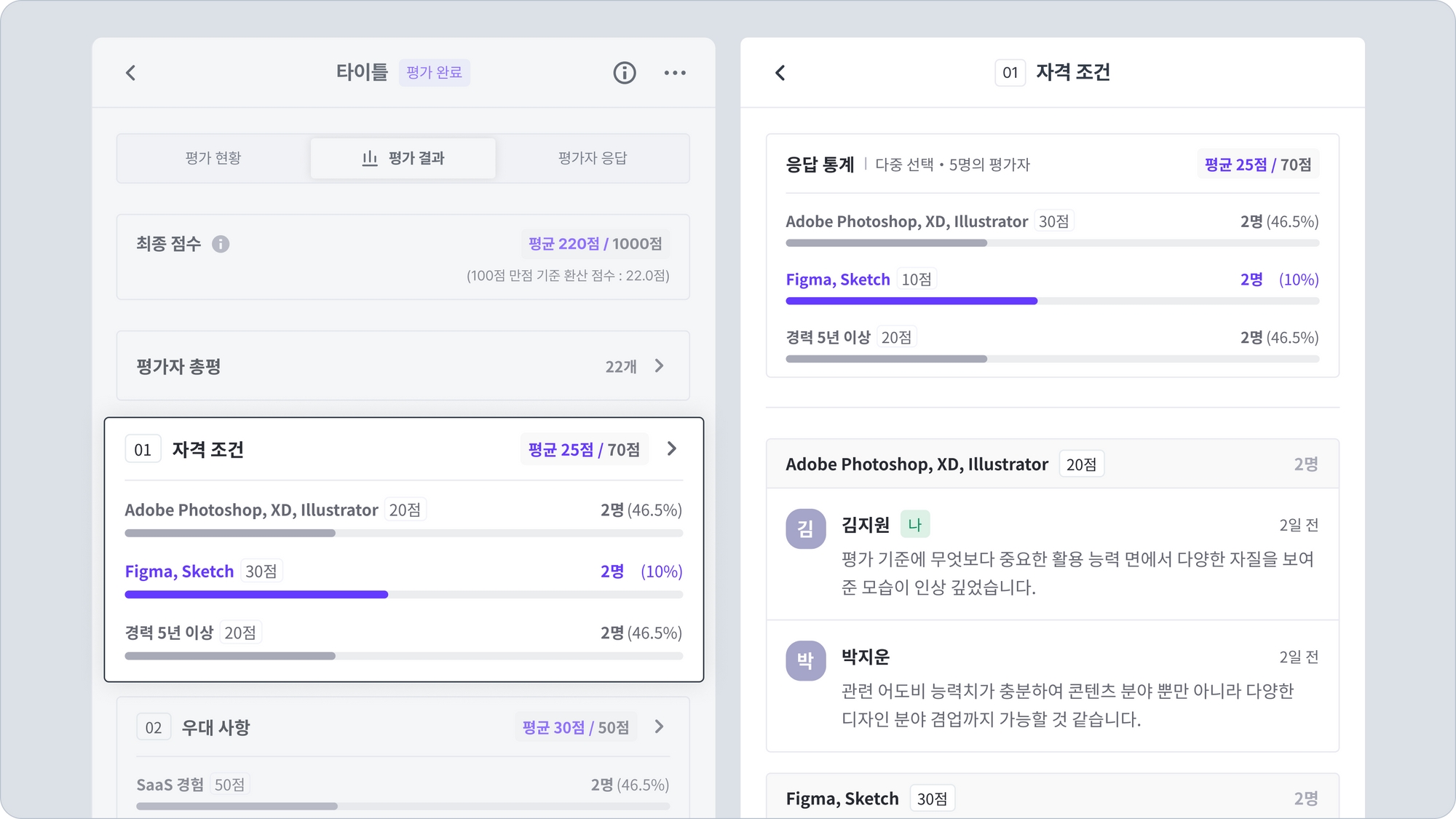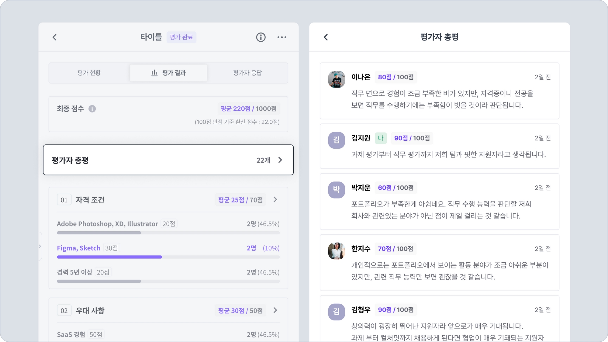 평가자들이 제출한 평가 결과를 확인하려면, 평가 결과 버튼을 클릭해 보세요.