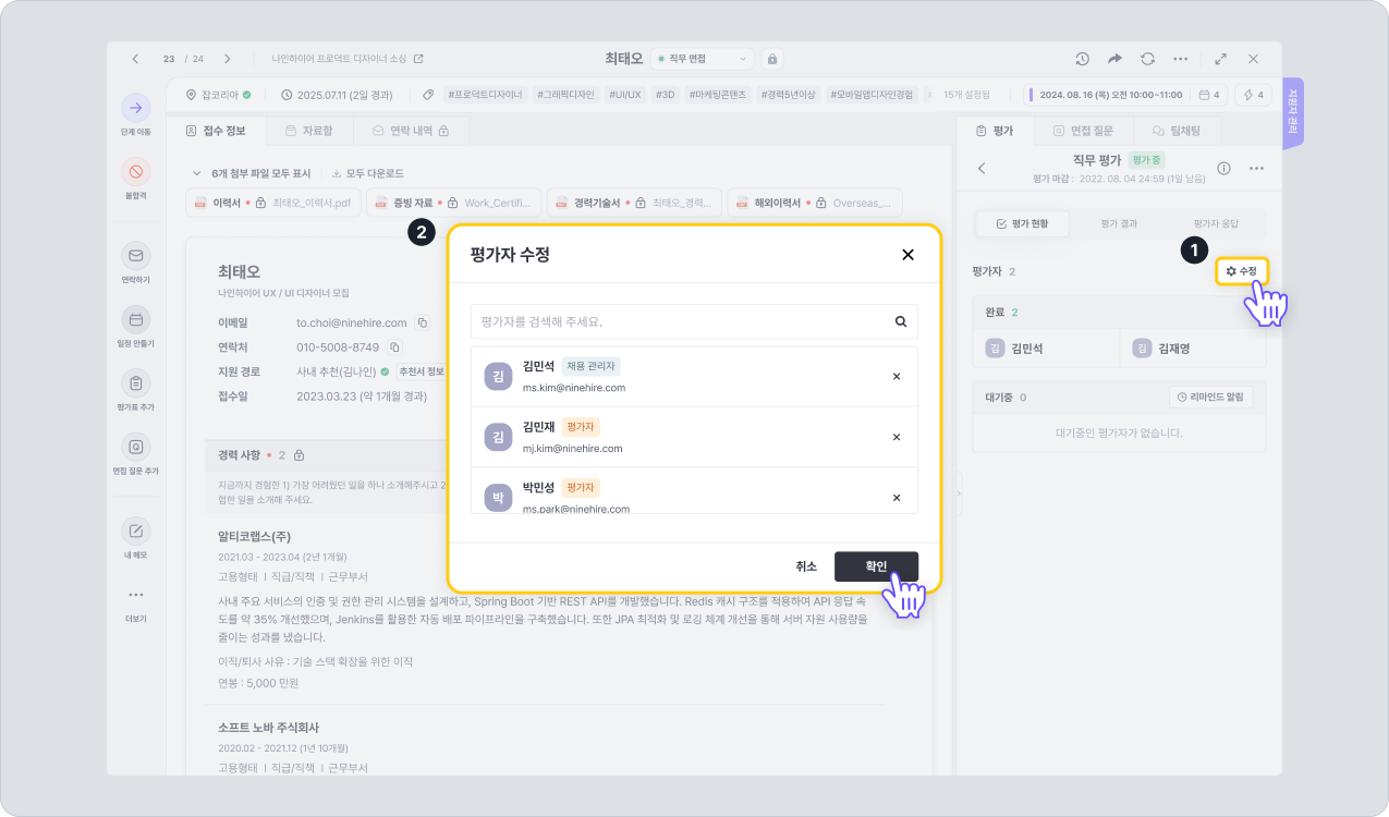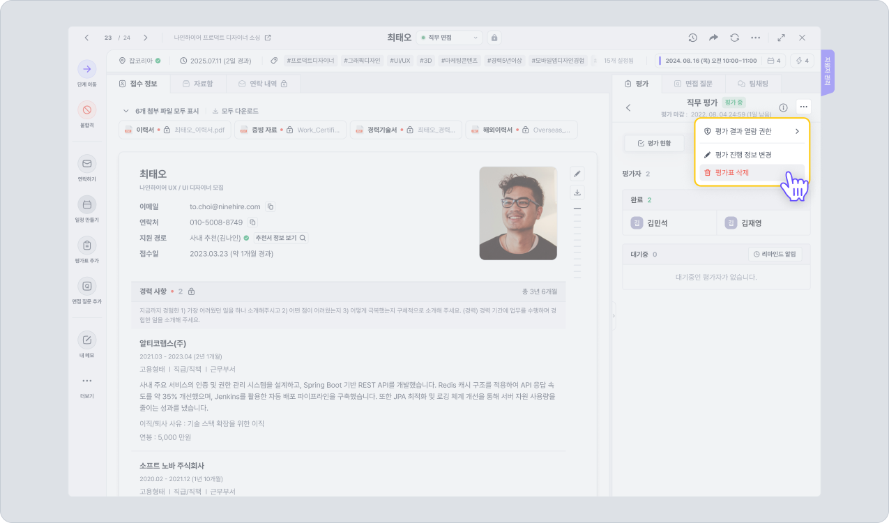 채용 담당자는 평가 중일 때 평가자들의 평가 내역을 삭제할 수 있습니다. 평가자의 경우 평가가 완료되기 전에는 제출한 평가표를 수정할 수 있습니다.