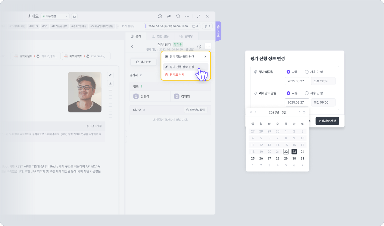 평가표 클릭 후, 평가표 제목 오른쪽에 위치한 …(더보기) 버튼을 클릭합니다. [평가 진행 정보 변경]을 클릭하면 평가 마감일과 리마인드 알림 설정을 변경할 수 있습니다.
