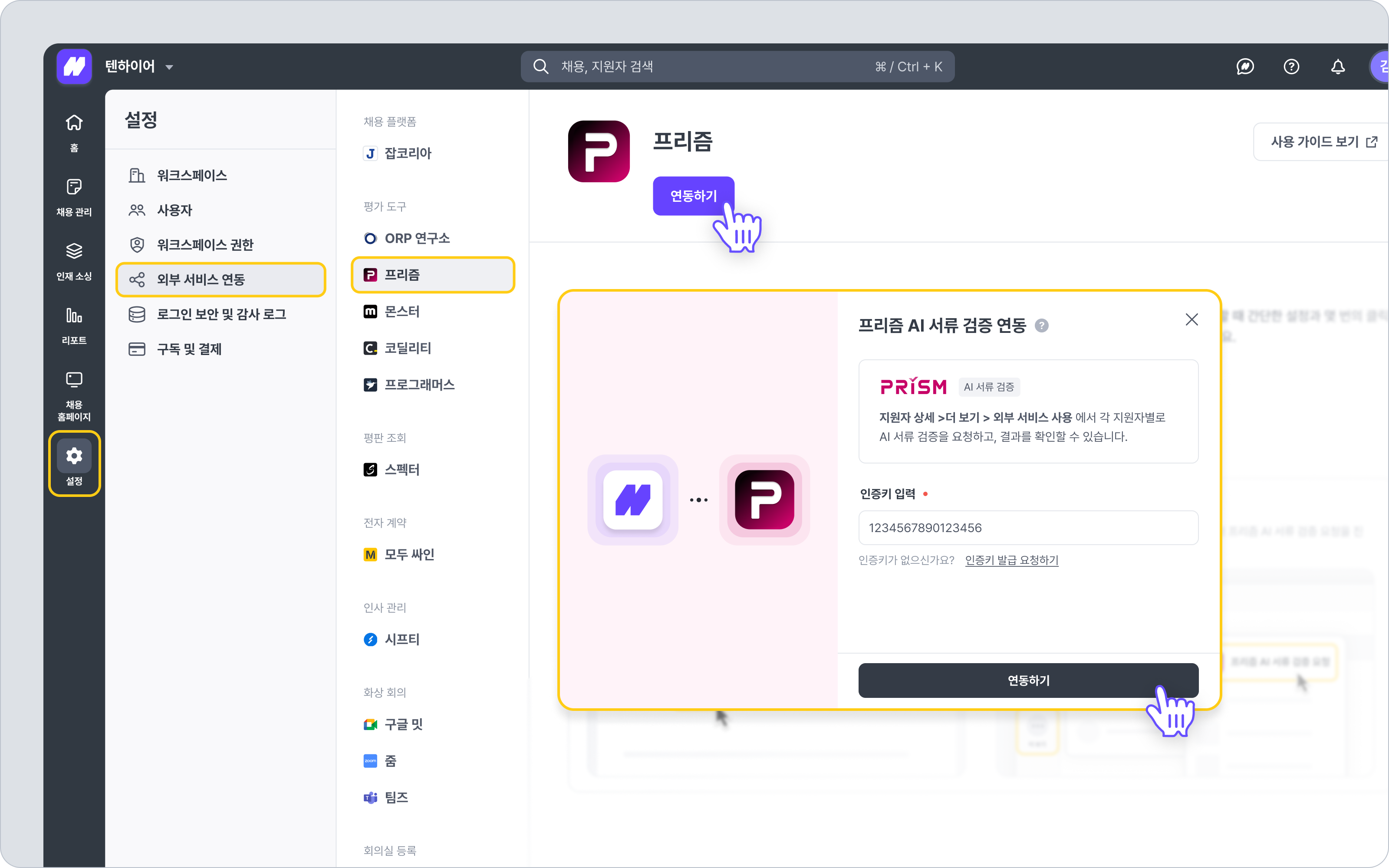 ◼ 기능 사용 권한 : 프리즘 연동 - 관리자 / 서류 검증 요청 - 채용 관리자 / 결과 열람 - 열람 권한자