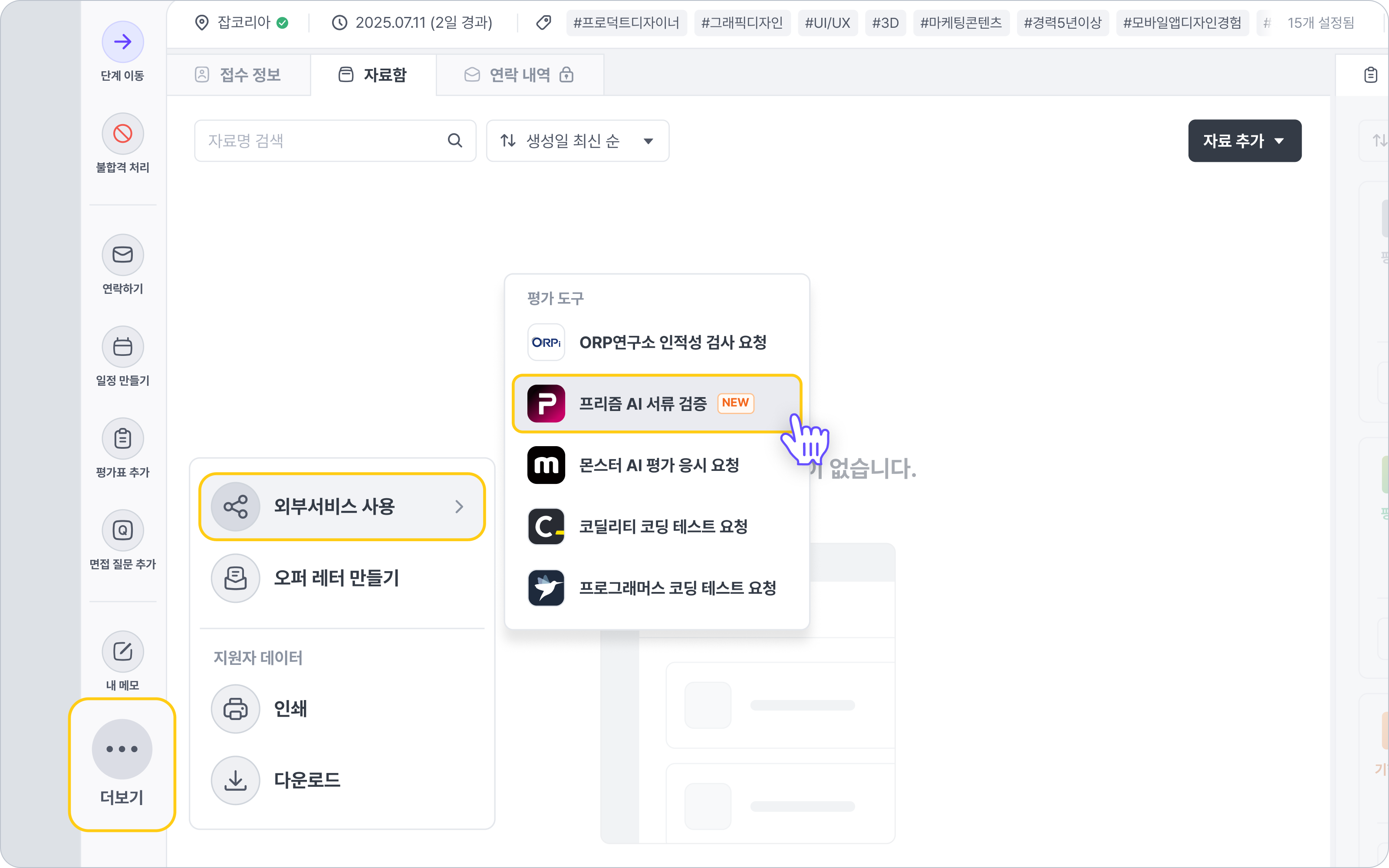 ◼ 경로1 : 지원자 상세 > 간편 액션바 더보기 > 외부 서비스 사용 > 프리즘 AI 서류 검증