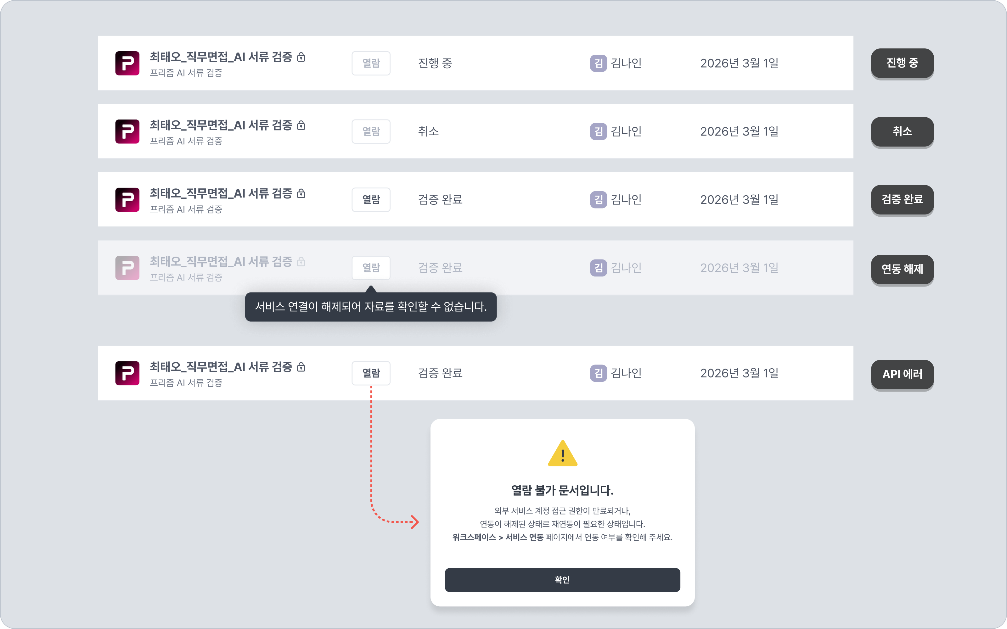 열람 권한이 없는 경우 결과 확인이 제한될 수 있습니다. 열람 권한은 서류 검증 진행 시 설정한 권한에 따라 결정되며, 관리자가 사후에 변경할 수 있습니다.