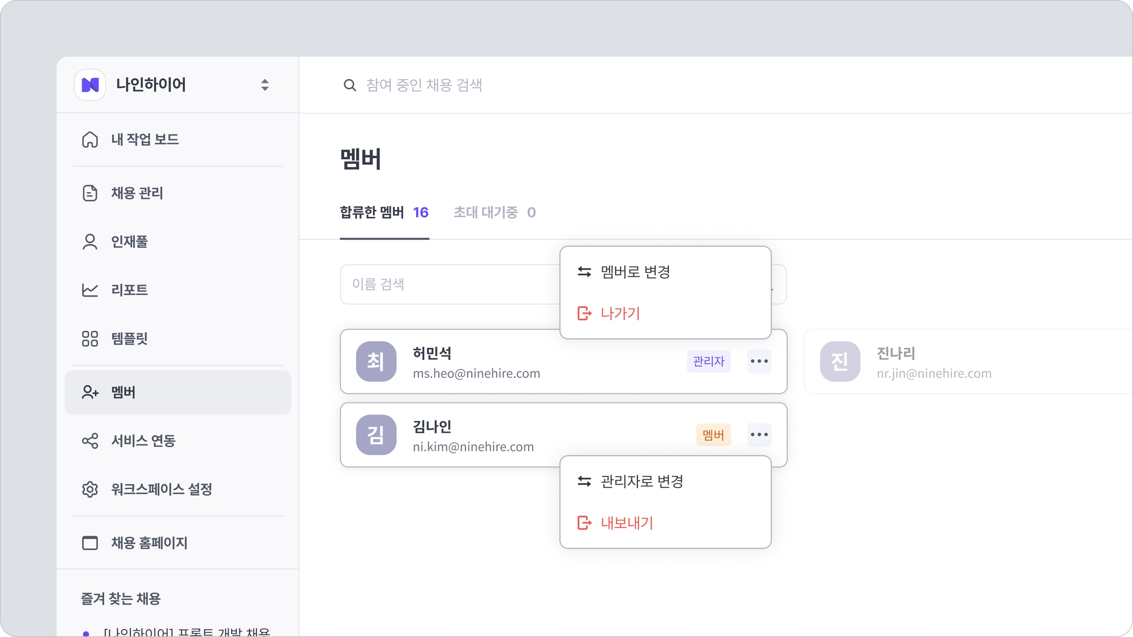 나 이외에 다른 관리자가 없다면 멤버(커스텀 권한)로 변경이 불가하며 혼자 관리자 권한으로 소속되어 있는 워크스페이스에서 나갈 경우, 나인하이어는 해당 워크스페이스의 채용 데이터는 모두 삭제되며 이 작업은 복구할 수 없습니다.
