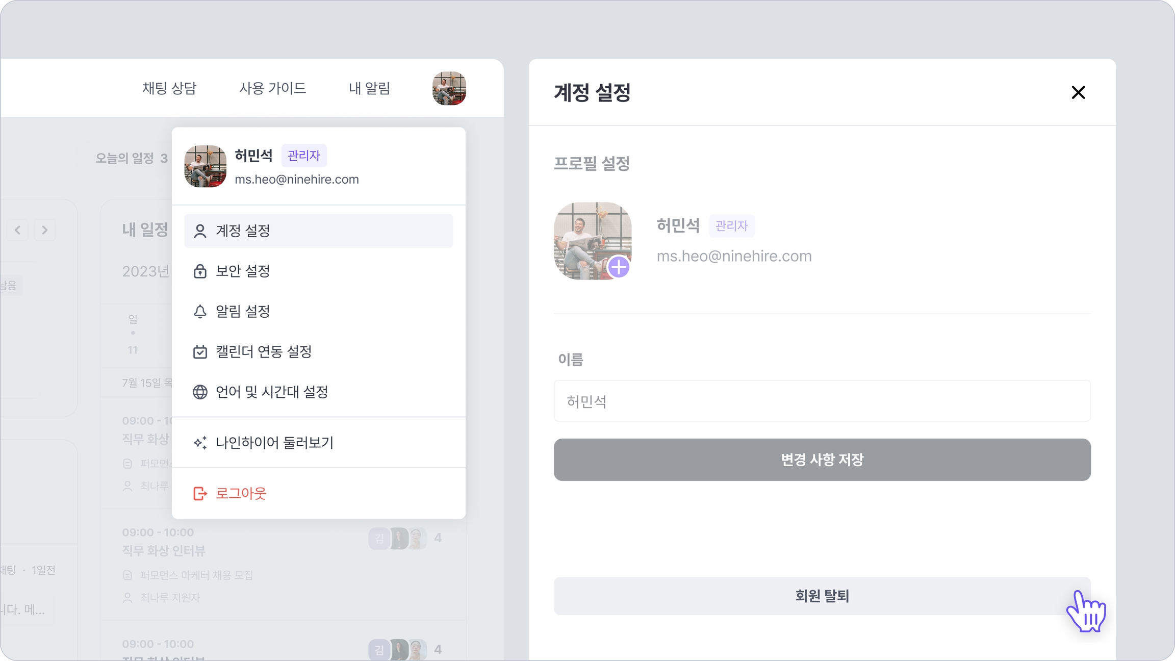 나인하이어 회원 탈퇴를 위해서는 관리자 권한을 가지고 있는 워크스페이스가 없어야 합니다.