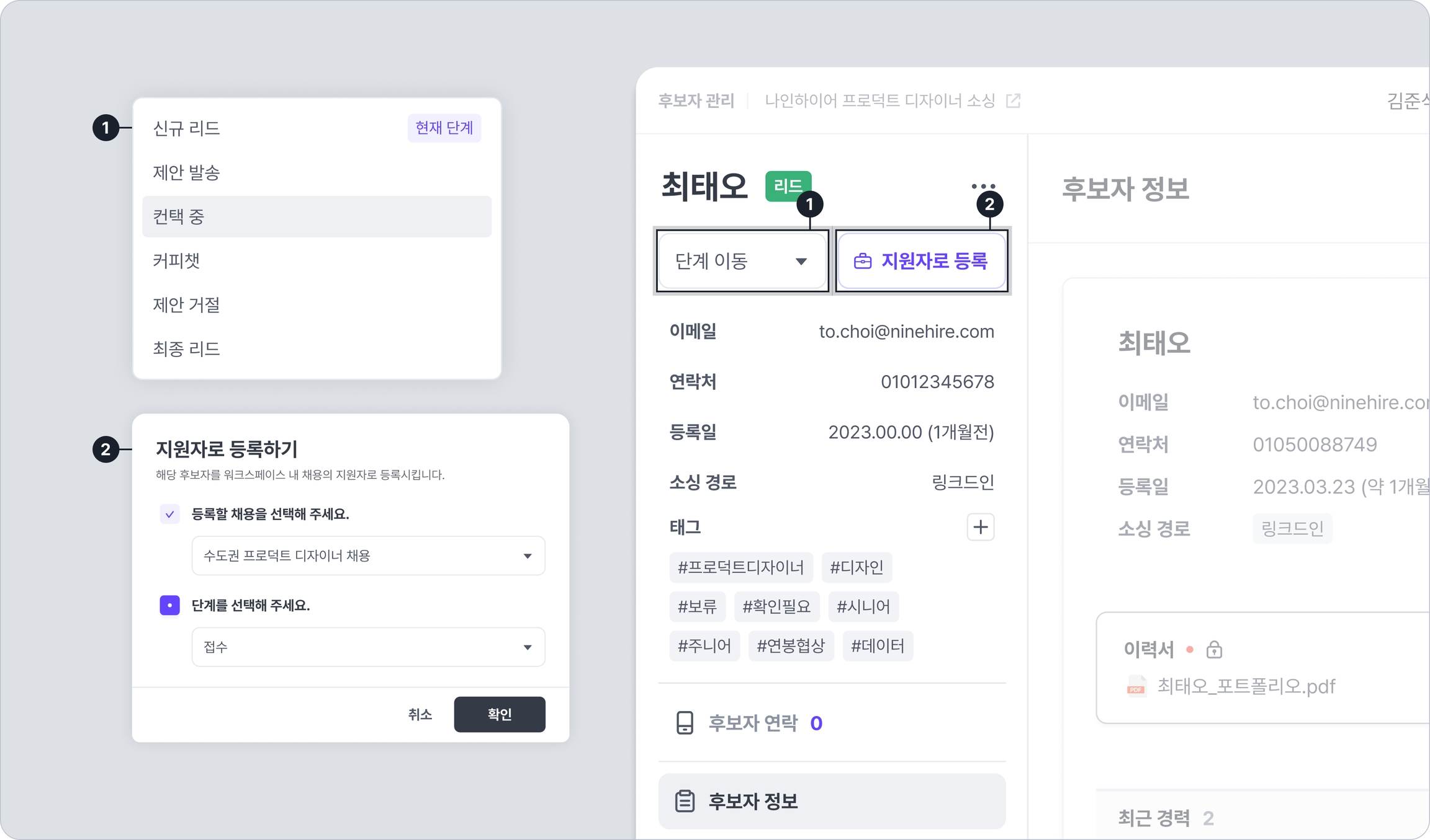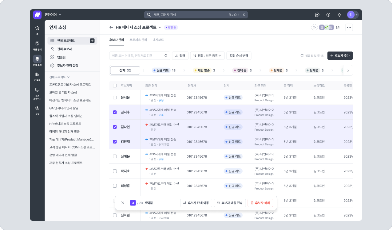 후보자 단계 이동: 선택한 후보자를 특정 단계로 이동시킵니다.