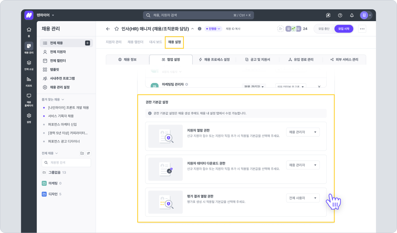 개별 채용의 설정 탭에서는 권한 기본값 설정이 가능합니다. 지원되고 있는 기본값 설정 항목은 다음과 같습니다.