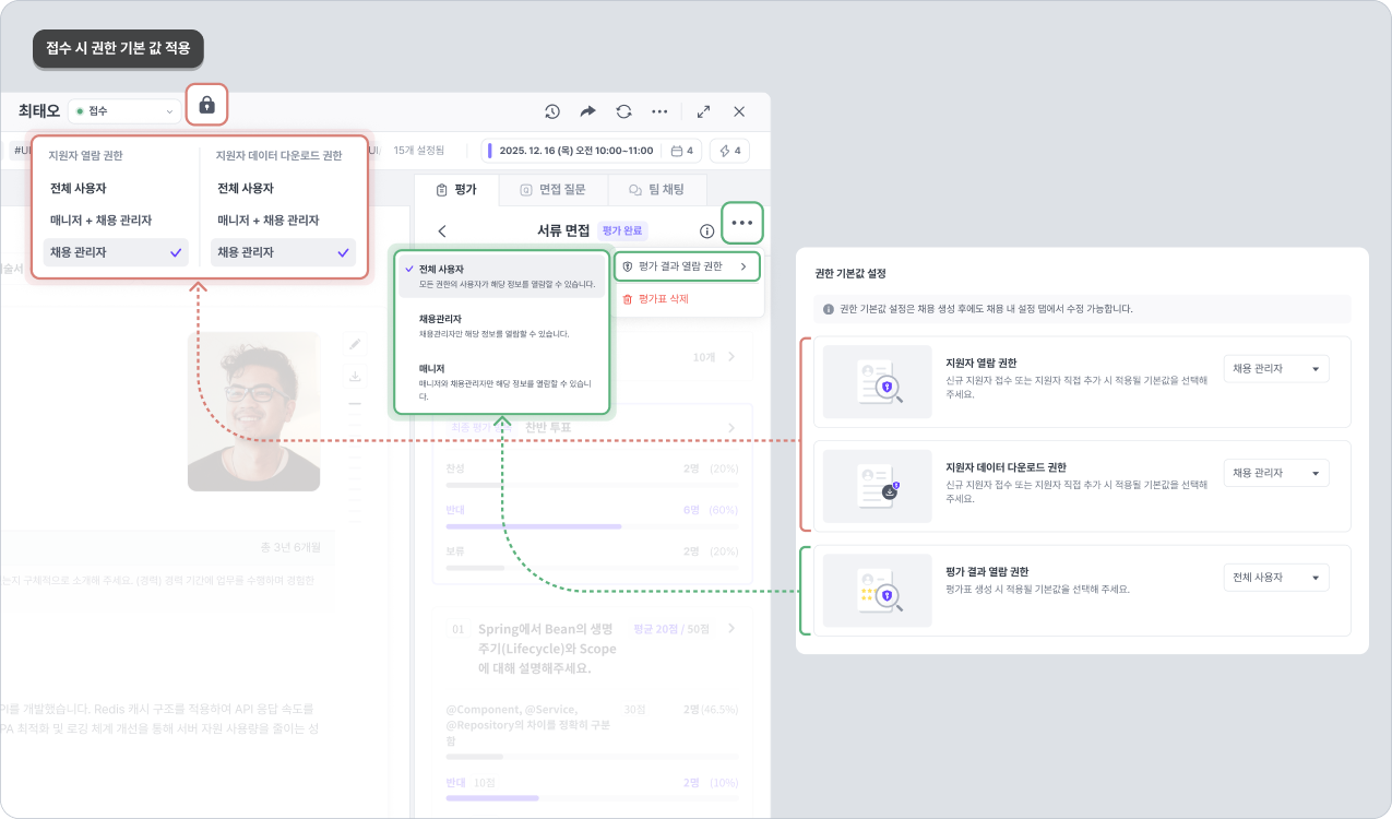신규 접수되는 지원자에게 설정되는 열람 권한, 정보 다운로드 권한, 평가 결과 열람 권한 등을 기본값(초기값)을 설정하여 채용 운영의 편의성과 안정성을 확보하세요.