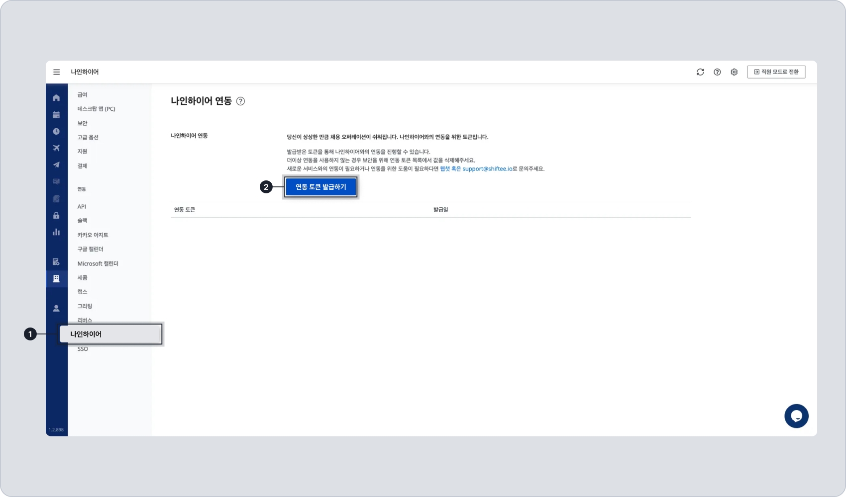 [시프티] 접속 → [회사 설정] → [연동 - 나인하이어] → [연동 토큰 발급하기] 클릭