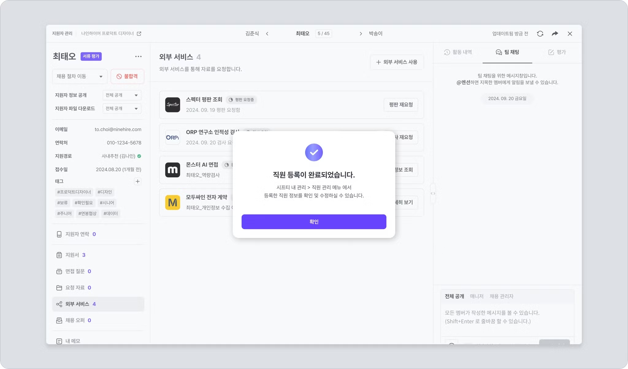 나인하이어에 등록된 지원자의 이름, 이메일, 연락처 정보가 자동으로 시프티 직원 정보로 입력됩니다.