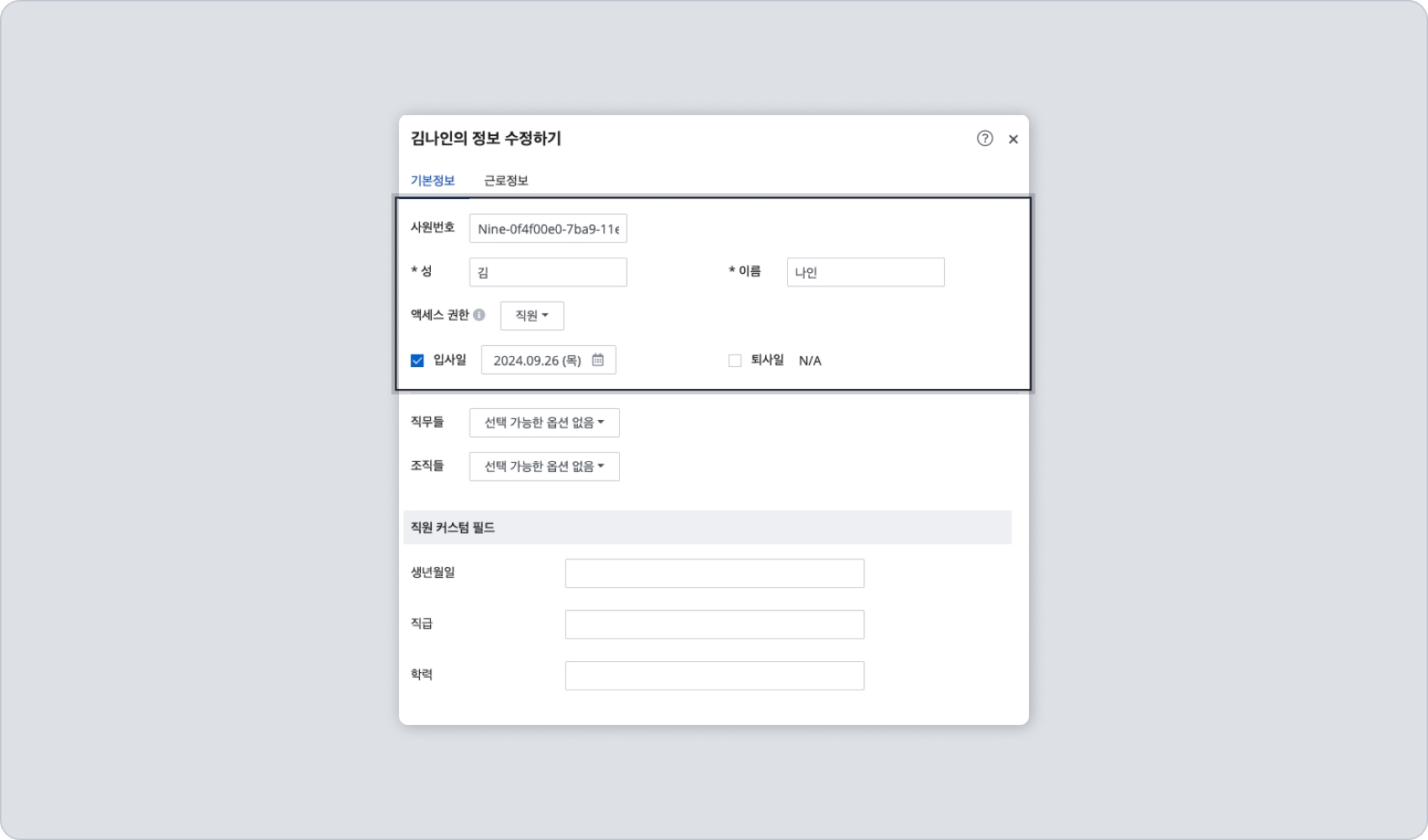 입사일: 오늘 날짜가 기본으로 입력되며, 과거 날짜를 선택하여 수정할 수 있습니다.