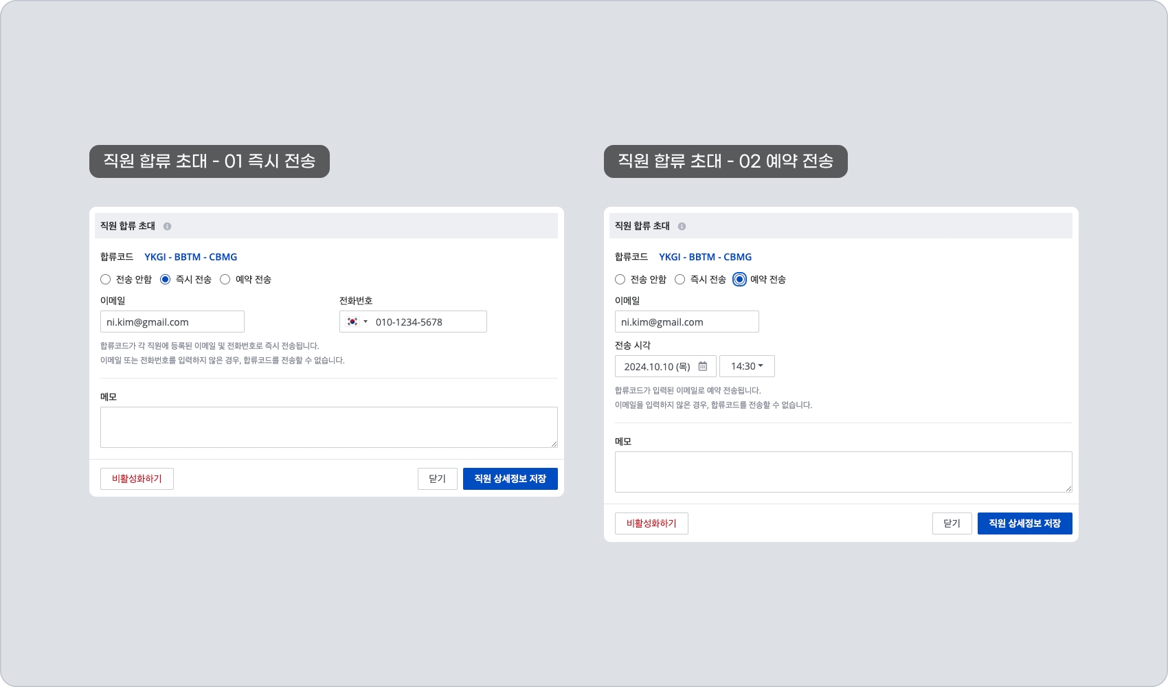 직원 정보 수정 모달에서는 직원 합류 초대 기능을 사용할 수 있습니다. 합류 코드를 메일로 "즉시 전송"하거나 "예약 전송"할 수 있습니다.