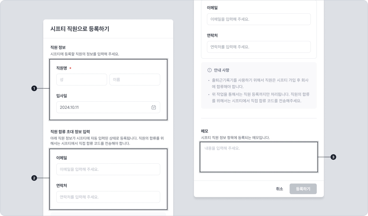 ③메모: 시프티 내 직원 정보 항목에 등록되는 메모를 작성합니다.