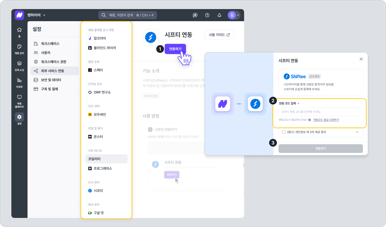나인하이어에서 시프티 연동 기능을 활용하기 위해서는 시프티 연동 코드를 입력하여 나인하이어에 연동해야 합니다.