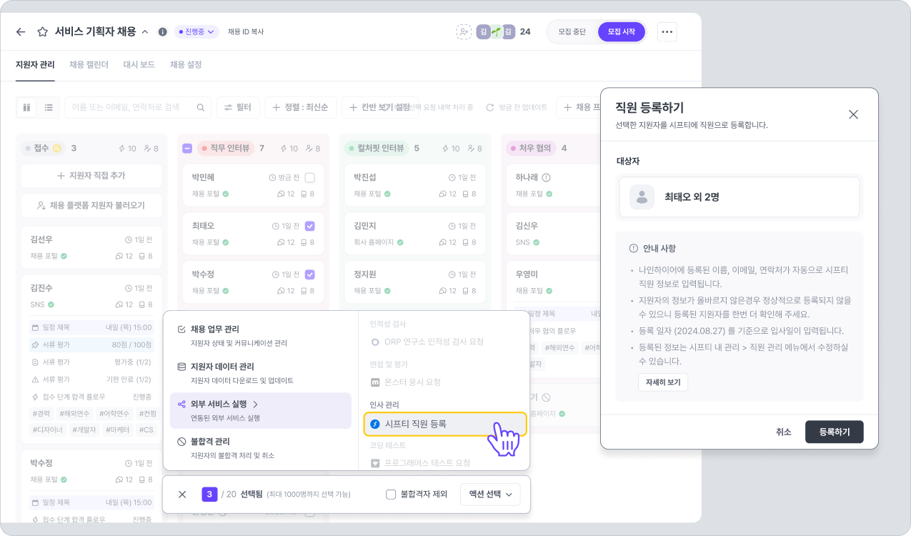 나인하이어 워크스페이스와 시프티 연동을 완료했다면, 단일 혹은 다중 방식으로 각 지원자를 시프티에 직원 등록 할 수 있습니다.