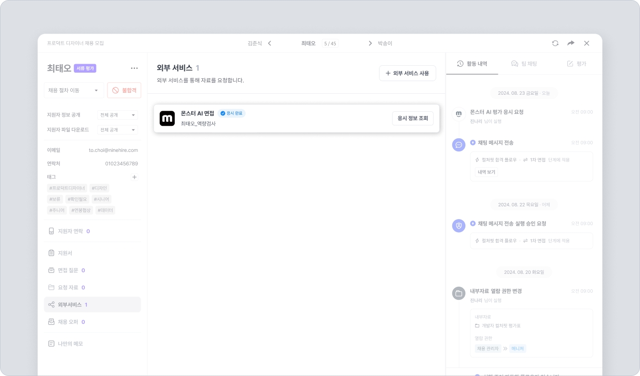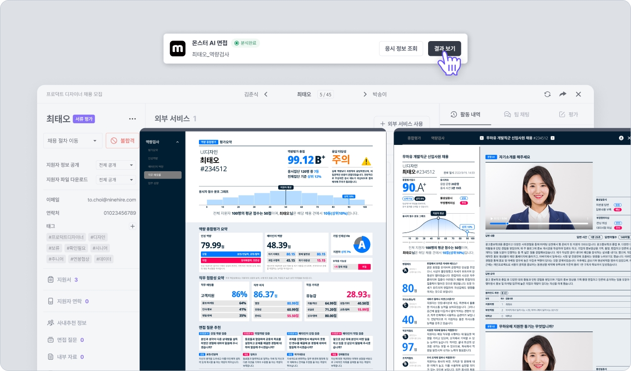지원자 평가를 위해 AI평가 기능인 몬스터를 활용 중이시라면, 나인하이어와 연동하여 사용해 보세요. 나인하이어에서 역량 검사, AI 면접 중 하나 혹은 둘 모두를 도구로 선택하여 활용할 수 있습니다. AI 면접의 경우, 질문을 직접 구성할 수도 있습니다. 이렇게 진행된 평가의 결과는 나인하이어를 통해 확인할 수도 있습니다.
