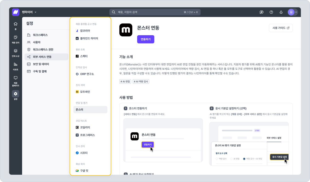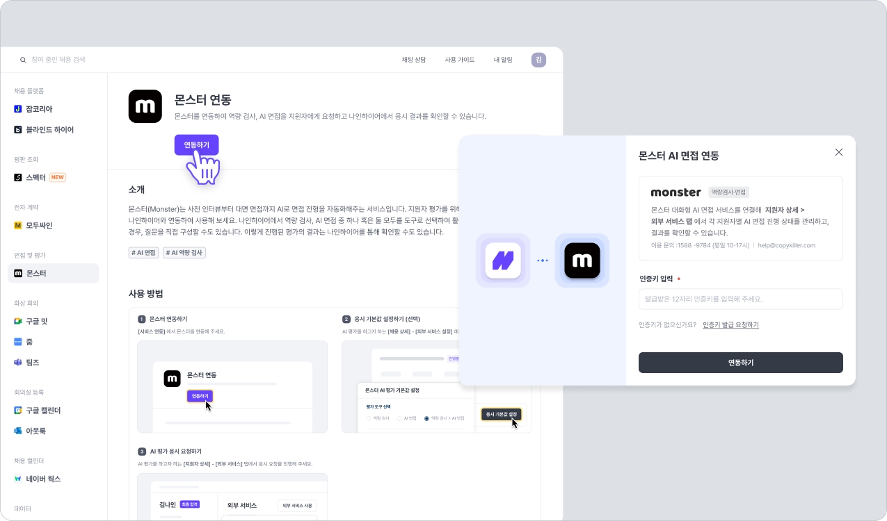 설정 > 외부 서비스 연동 > 면접 및 평가 > 몬스터 경로로 접근하여, 연동하기 버튼을 클릭합니다. 몬스터 측에서 수신한 12자리 인증키를 입력한 후 [연동하기] 버튼을 클릭합니다. 나인하이어 워크스페이스와 몬스터 계정 연동이 완료됩니다.