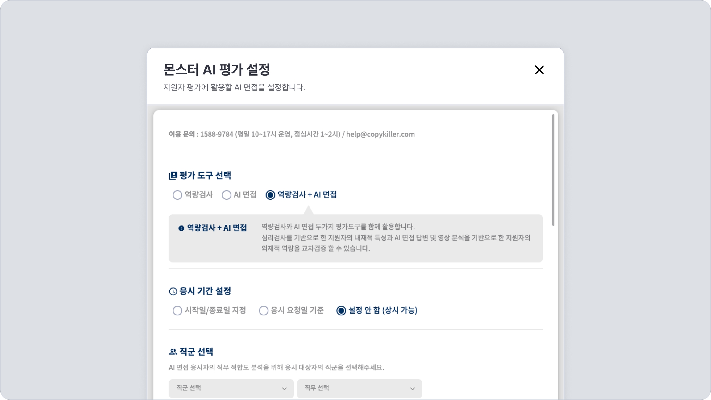 평가 도구 선택 : 역량 검사, AI 면접, 역량검사+AI 면접 중 하나를 선택합니다.