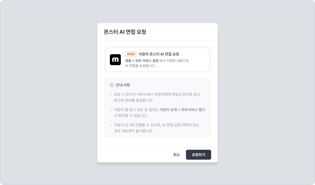 응시 요청 모달이 나타나며, 요청 버튼을 클릭하면 몬스터 서비스에서 지원자에게 메일과 문자로 응시 링크와 정보를 발송합니다.