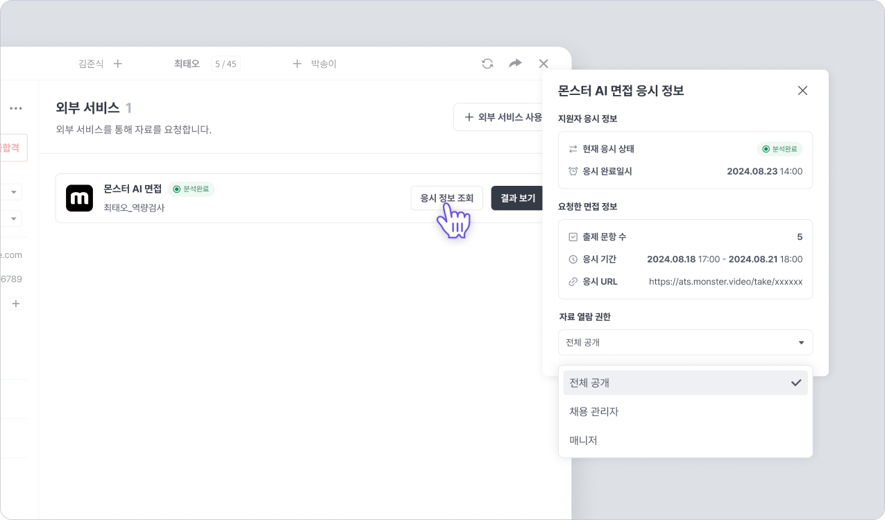 몬스터를 통해 분석이 완료된 자료에 대한 열람 권한을 설정할 수 있습니다. 외부서비스 탭에서 해당 건에 표시된 응시 정보 조회 버튼을 클릭한 후 나타나는 창에서 자료 열람 권한을 알맞게 설정합니다.