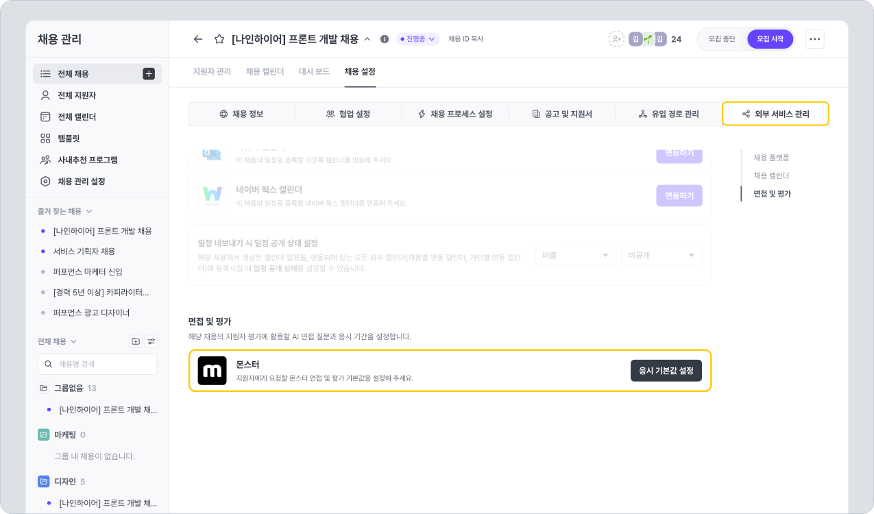몬스터 면접 및 평가의 응시 기본값을 채용별로 설정합니다. 설정하려는 채용 내 외부 서비스 관리 탭으로 이동합니다. 면접 및 평가 > 몬스터 항목에 표시되는 [응시 기본값 설정]을 클릭합니다.