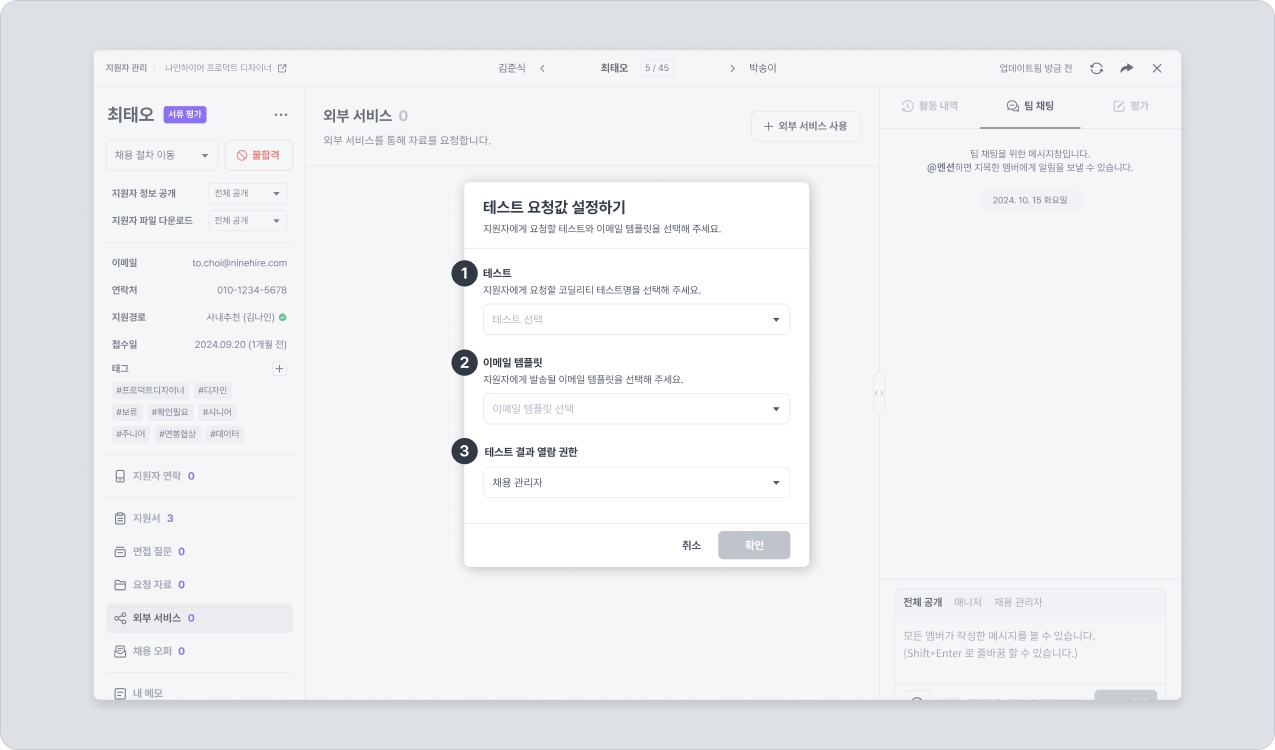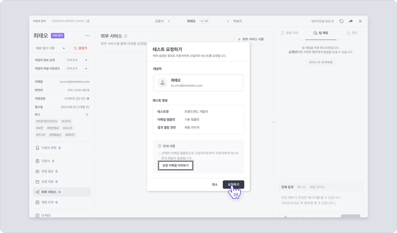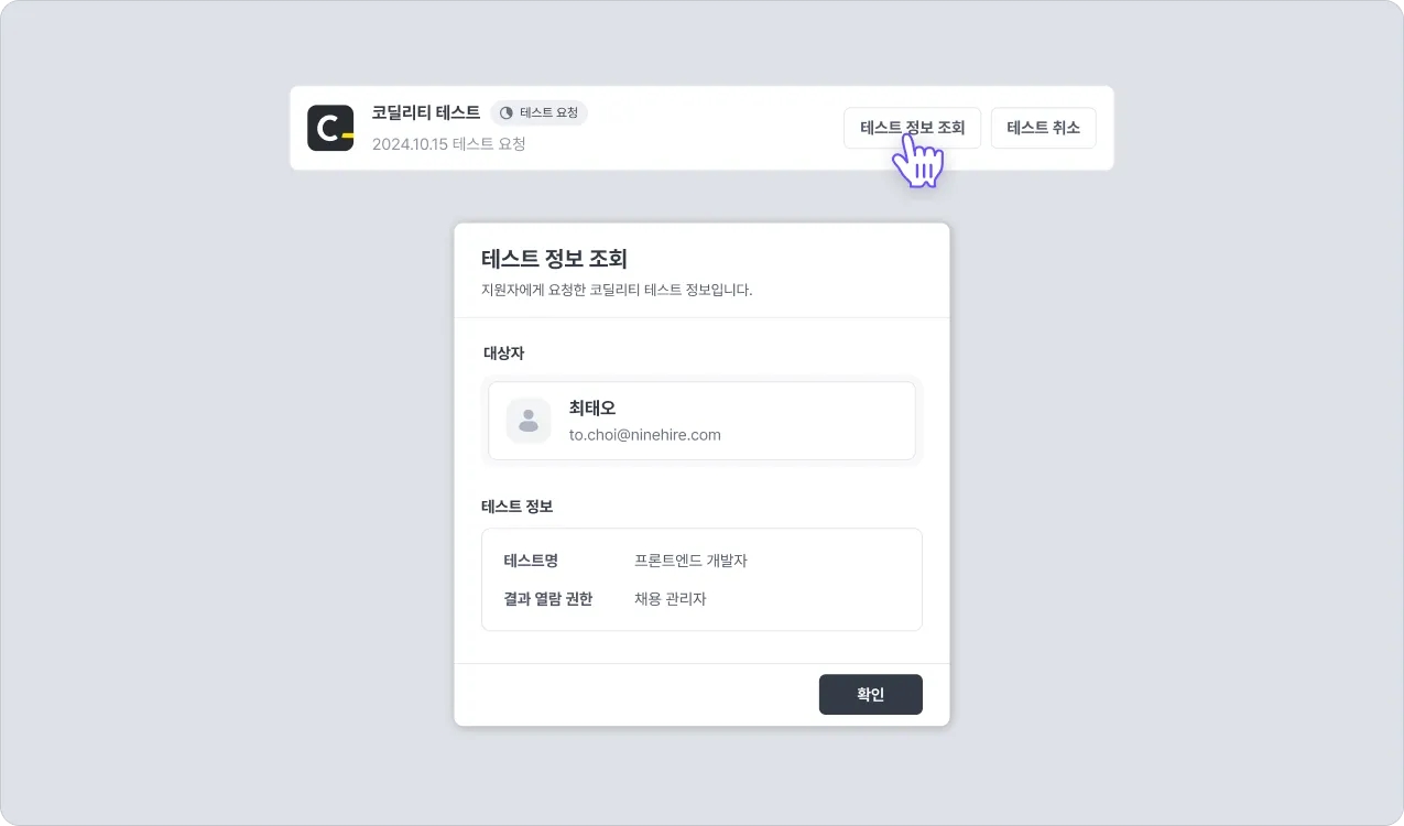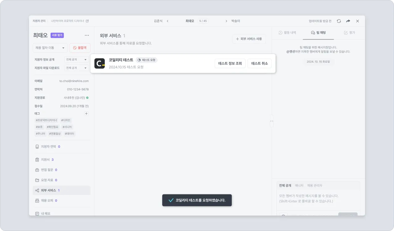 나인하이어 워크스페이스와 코딜리티 연동을 완료했다면, 이제 각 지원자에게 코딜리티 테스트를 요청하고 테스트 결과를 열람할 수 있습니다.
