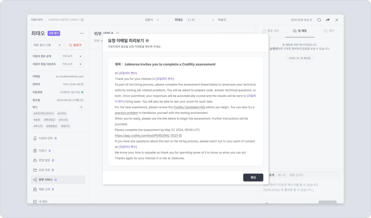 지원자 상세 화면의 간편 액션바나 자료함에서 코딜리티 테스트 요청을 보낼 수 있습니다.