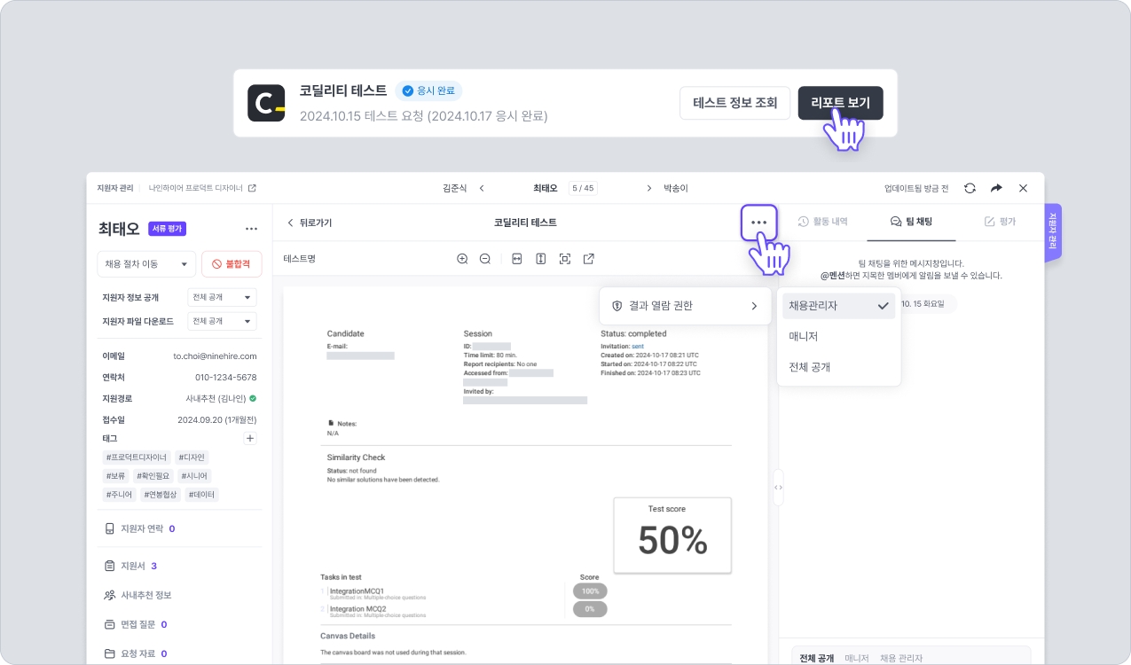 테스트 응시가 완료된 정보와 리포트는 해당 테스트에 설정한 열람 권한(채용관리자/매니저/전체 공개)에 맞춰 충족 시 열람이 가능합니다.