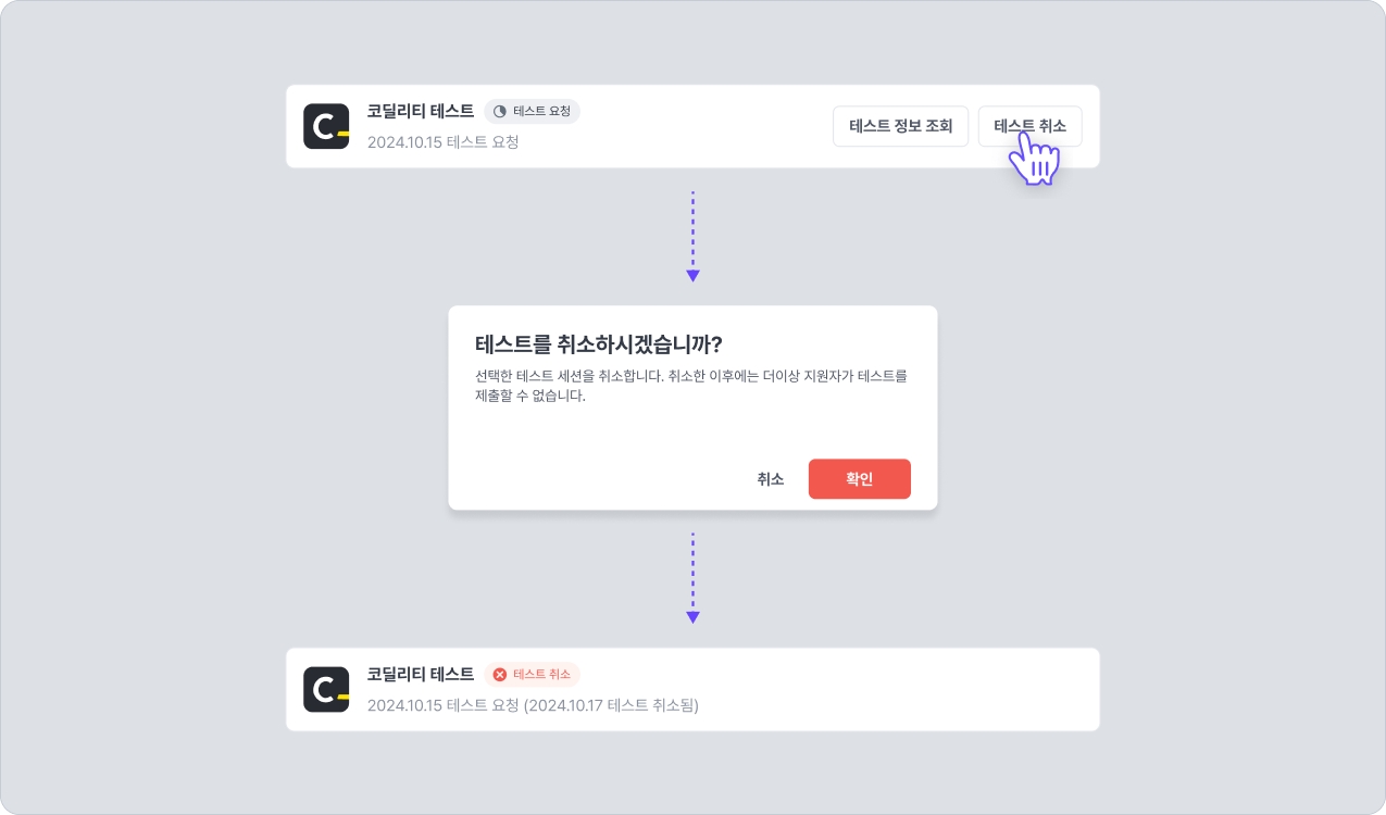 테스트 요청 상태의 항목의 [테스트 취소] 버튼을 클릭하면, 요청한 테스트를 취소할 수 있습니다. 취소가 완료되면 테스트의 상태가 "테스트 취소"로 표시됩니다.