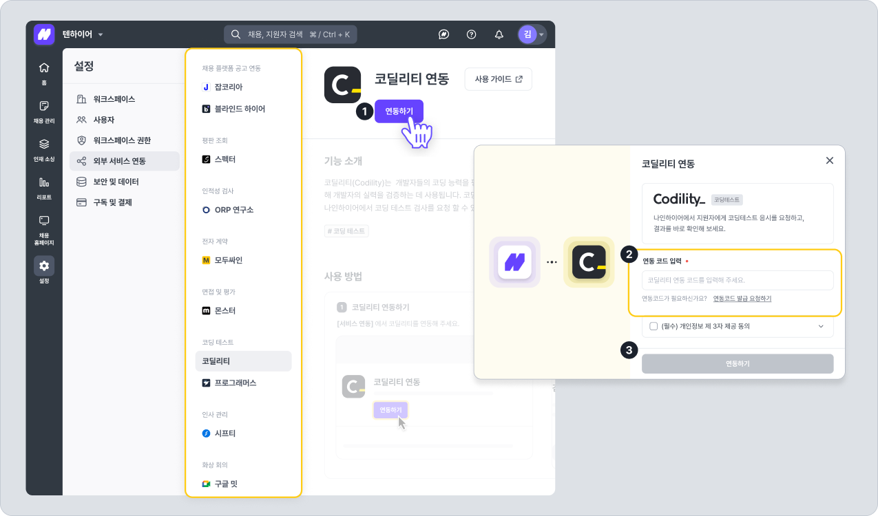 나인하이어에서 코딜리티의 코딩 능력 평가 기능을 활용하기 위해서는 연동 코드를 발급받아 입력하여 나인하이어와 연동을 진행해야 합니다.
