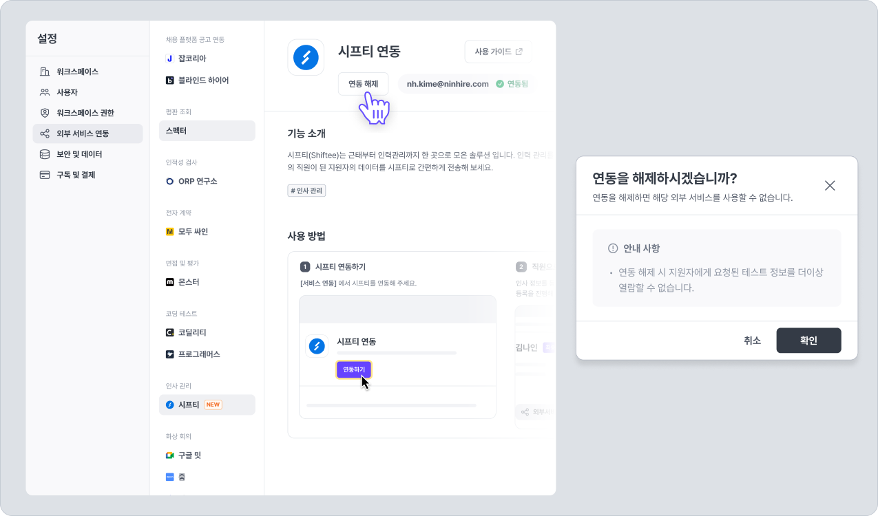 연동 해제 시, 기존에 요청하여 받은 테스트 결과 조회가 나인하이어 내에서 더이상 불가하며, 기존 요청한 지원자 테스트 상태의 갱신 또한 불가합니다.