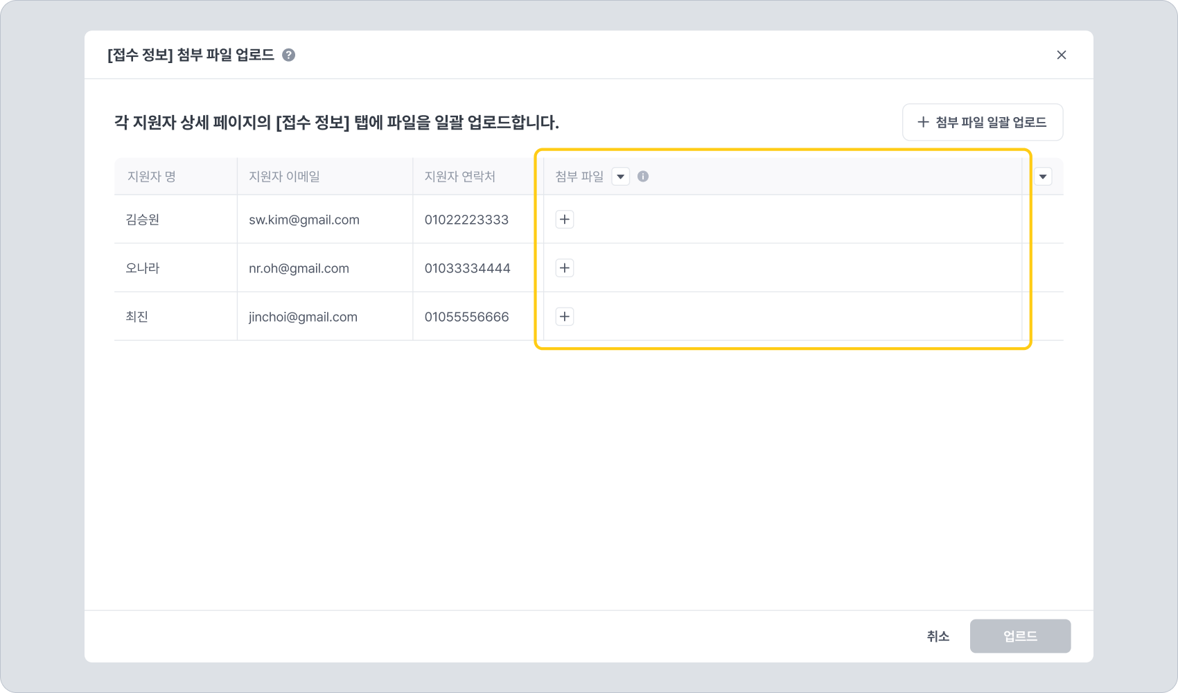 각 지원자 및 자료별로 첨부 파일도 업로드할 수 있습니다. 첨부 파일 추가는 일괄 추가 혹은 지원자별 추가 방식 모두 활용 가능합니다.