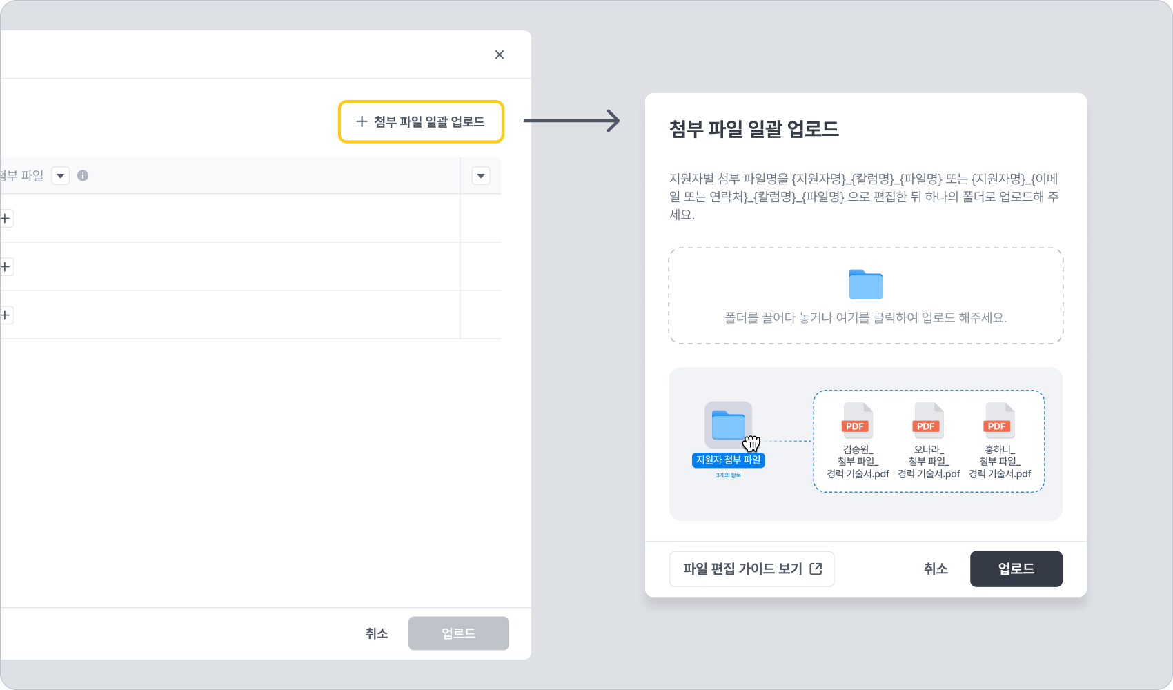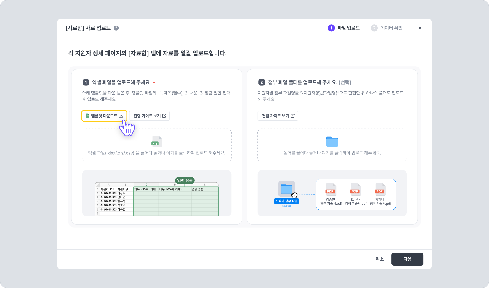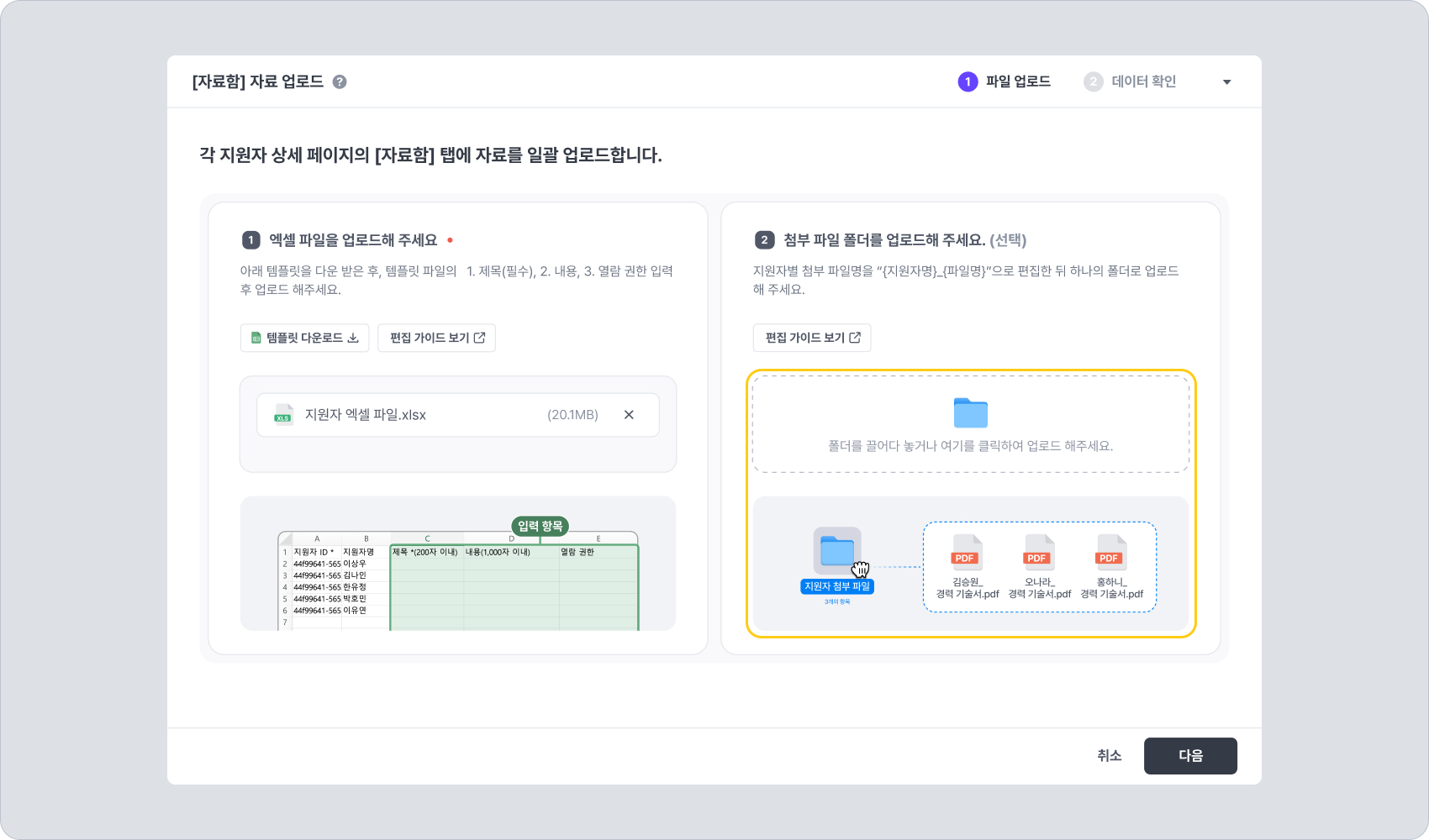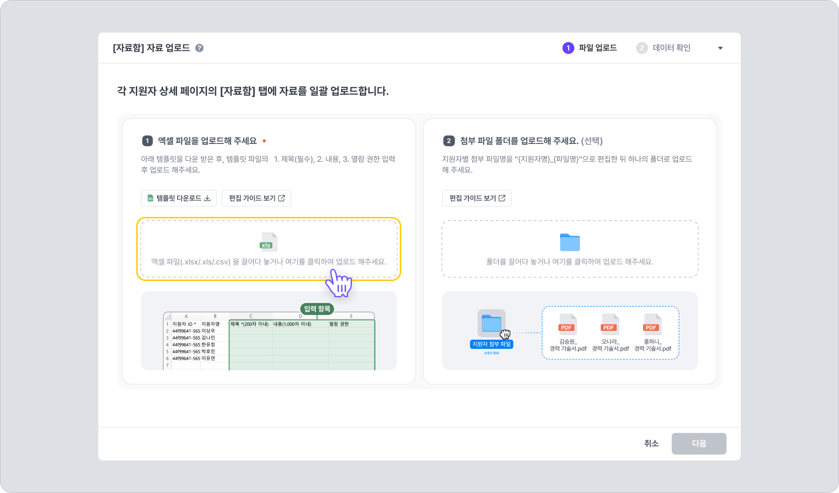 이 방식은 파일명을 편집해 두고, 지원자별로 첨부 파일을 매핑하여 일괄 업로드하는 방식입니다.