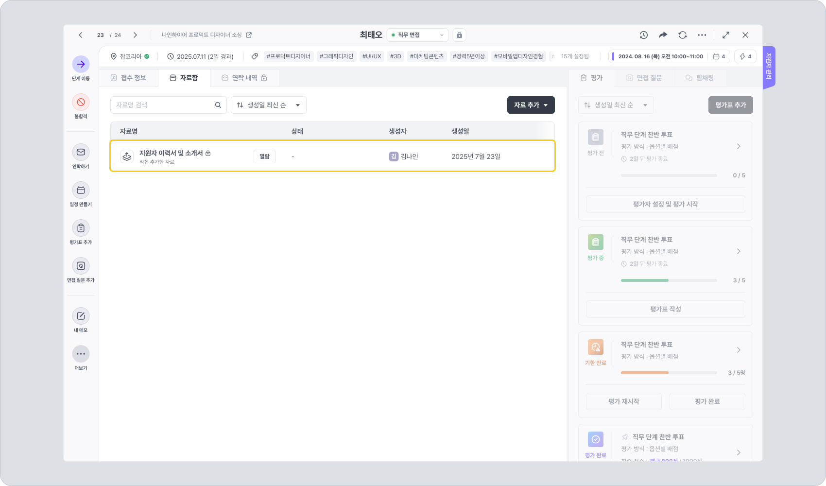 여러 명의 지원자에 대한 자료를 자료함에 일괄 업로드할 수 있는 기능입니다. 업로드가 완료되면 위와 같이 지원자 상세 화면 내 자료함에 각 지원자의 자료가 추가됩니다.
