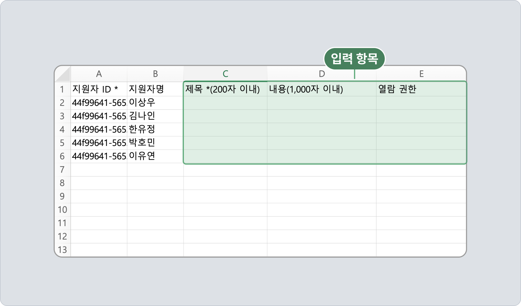 임의로 컬럼(열)을 추가/삭제하면 업로드 시도 시 에러가 발생합니다. 고정된 열 구성이므로 임의로 열을 추가/제거하지 마십시오.