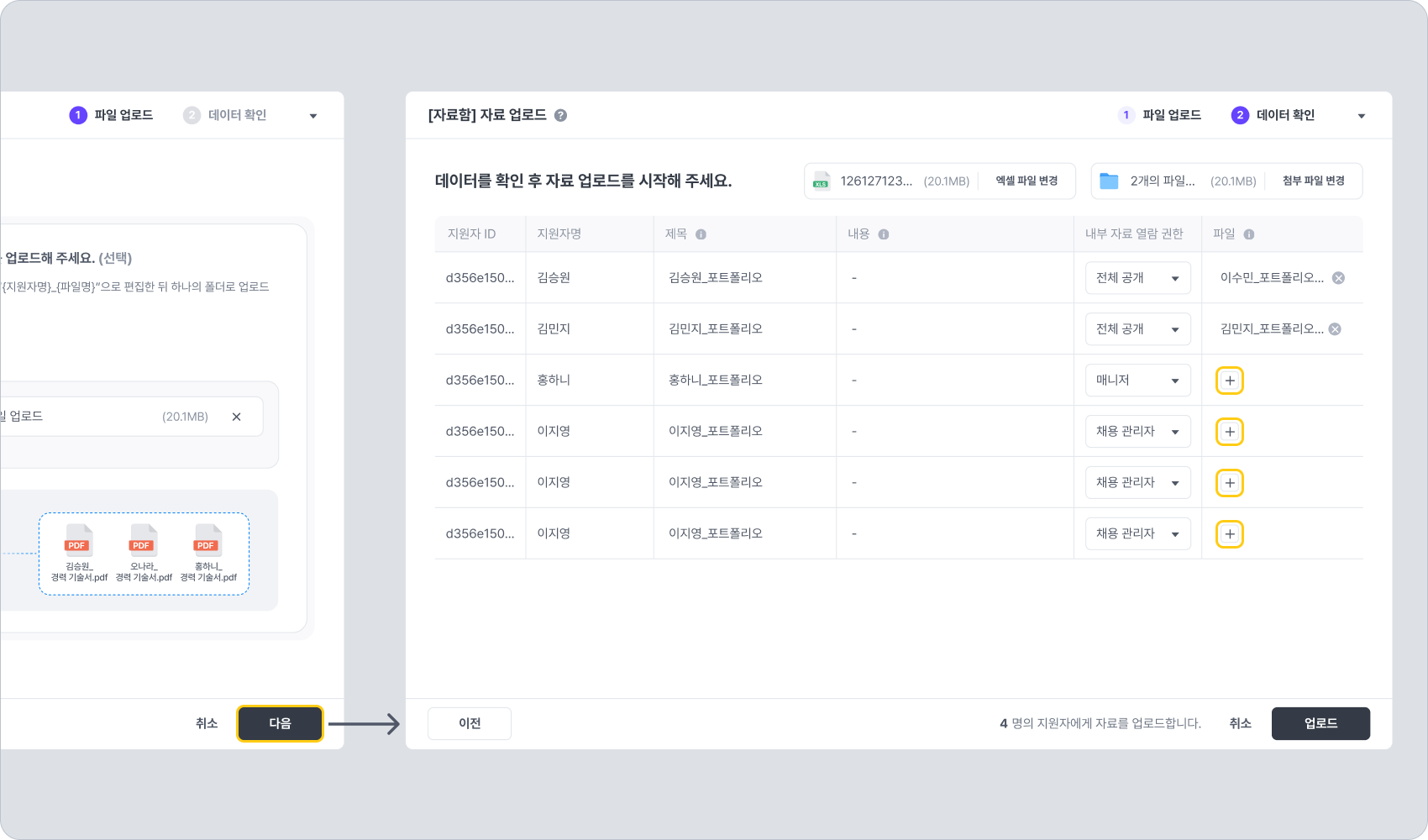 확인이 완료되었다면 [업로드] 버튼을 눌러 업로드를 진행합니다. 이렇게 업로드한 파일은 지원자별 자료함 탭에 자료로 추가됩니다.